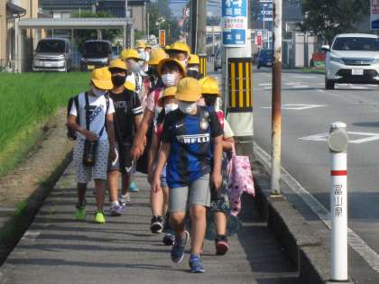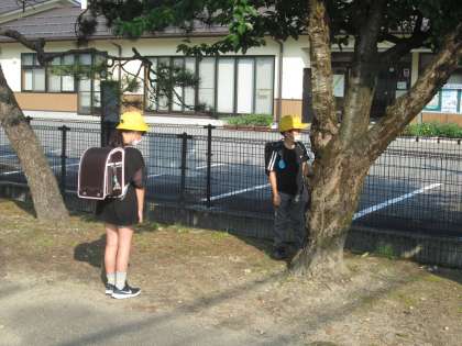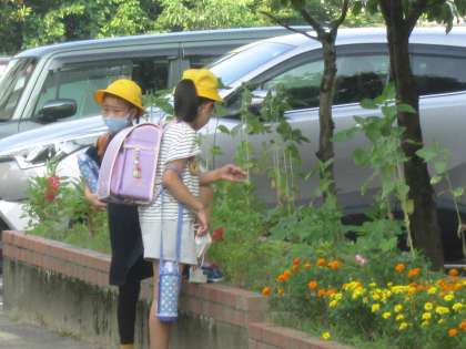 終業式前日、6日(木)の朝です。今朝は、朝から大変暑く、汗をかきながら頑張って集団登校する子供たちが印象的でした。昨日のいちょうタイムでは、熱中症対策として「できるだけ日陰で遊ぼう」「お茶を持参して遊ぼう」などと全校放送で呼びかけました。登校するやいなや、花壇の植物を観たり樹木のセミを探したりする子たちを見かけました。短い夏休みですが、身近な自然に親しめる機会があったらいいなと願います。