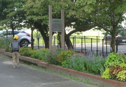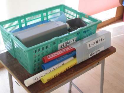 飼育栽培委員の子供たちのおかげで、体育館横の花壇の花が息を吹き返している27日(木)の朝です。昨日の結団式を経て、「運動会がんばるぞ!」という意気込みを書いたカードとリレー練習用のバトンが登場しました。手前のバトンには、団長からのメッセージが付いています。暑さを避けながら、少しずつ運動会モードに入っていきます。