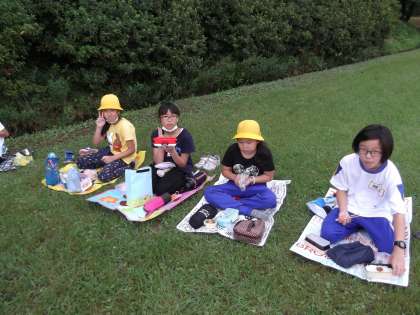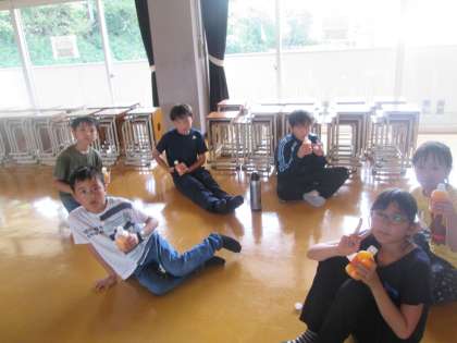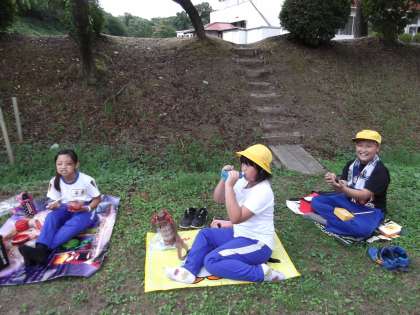 写真は、探検から帰ってきたときのジュースタイムとお昼のときの様子です。各班自然の中で、仲間と一緒に美味しくお弁当をいただきました。