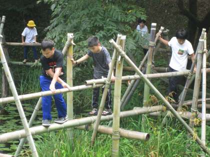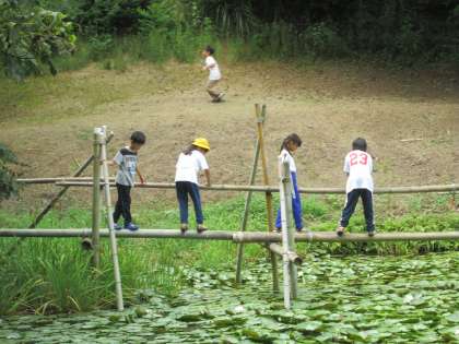 こちらは、池ジャングルの様子です。竹で作られた道を通るのはハラハラしましたが、上手に渡るコツを教え合っている場面もあり、全員何度も渡ることができました。