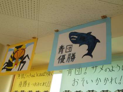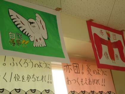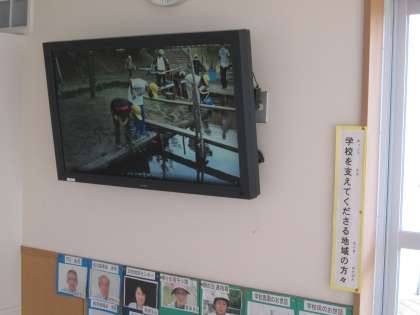 玄関に6年生が描いた4団の応援ボードが出現し、下の学年の子供たちが立ち止まって見ていました。また玄関に設置してあるモニターの映像が、動画になりました。初めての試みで上手く作動しない場面もあるようですが、これまた太田っ子を楽しませてくれそうです。