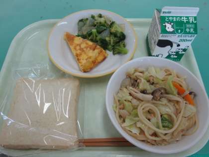 本日の献立は、スパニッシュオムレツ、こんにゃくサラダ、ツナとキャベツのスパゲッティです。