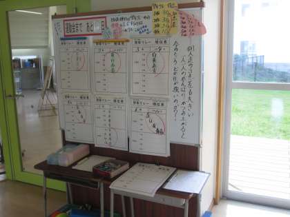 今は太陽は出ているものの、それほど気温が上がらない予定の14日(月)です。運動会まで6日。全校で集まれない運動会で団結力を高めるために、玄関に写真のようなボードを設置しました。授業で行った各学年のリレー結果の速報を紹介することで、励まし合ったり鼓舞したりする契機になればよいと思っています。現在のところ優勢なのは・・・。
