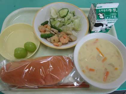 本日の献立は、えびときのこのガーリックソテー、そえ野菜、野菜ポタージュ、シャインマスカットです。