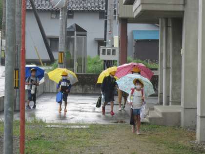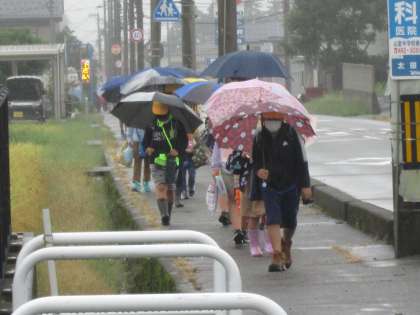 小雨もあって肌寒い28日(月)の朝です。子供たちの服装を見ても、「季節が変わってきたな」と実感します。6年生のある子は、金曜日の校外学習(室堂散策等)に向けて登山靴を試していました。雨の中、交通指導に立っている方に、しっかり挨拶している子がいて気持ち良かったです。
