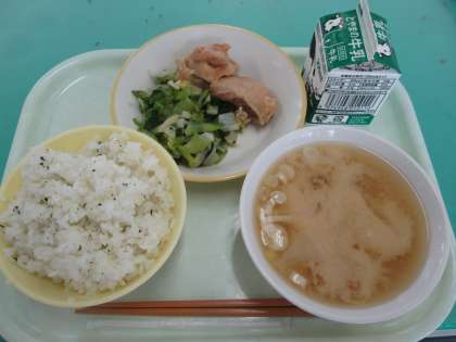 本日の献立は、鶏肉の米粉揚げ、おひたし、五目みそ汁です。