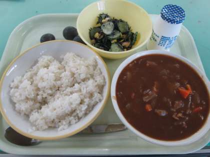 本日の献立は、たべキリンハヤシ、大豆とひじきのサラダ、巨峰、飲むヨーグルトです。