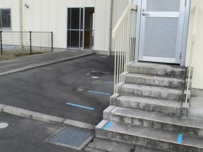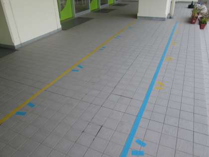 ※ 写真左「体育館入り口」(消毒・検温・除菌シート)、中「引き渡し:正面玄関」・右「引き渡し:プール横」(ラインに沿って間隔を空け、一家庭お一人で)