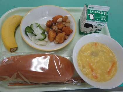 本日の献立は、魚とひよこ豆の甘からめ、かぶのサラダ、卵コーンスープ、バナナです。