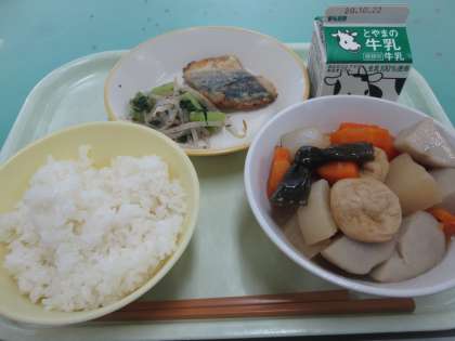 今日の献立は、ごはん、牛乳、鰆の西京焼き、梅肉和え、おでん です。