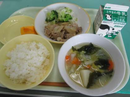 本日の献立は、豚肉のジャンロー、そえ野菜、じゃがいものみそ汁、柿です。