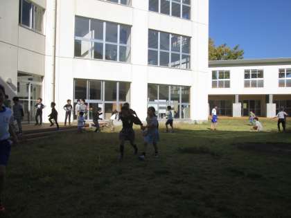 今日の「いちょうタイム」も、秋晴れの気持ち良い時間でした。中庭では、けいどろの2年生(20数人?)対4年生(9人)の対決が始まりました。芝生を駆け巡りデッキに乗って走り、大騒ぎでした。学年の集まりがあって4年生が去った後は、2年生だけの鬼ごっこに、1年生も数人集まって鬼ごっこが始まりました。
