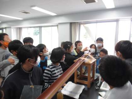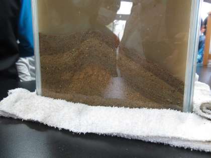 雨どいに土を置き、水と一緒に流れてきたものが水槽に溜まっていきます。すると、粒の大きさや色が異なる層ができていきました。実験に進んで参加したり、じっくり観察したりしながら、実際に見て学ぶことの良さを味わうことができました。