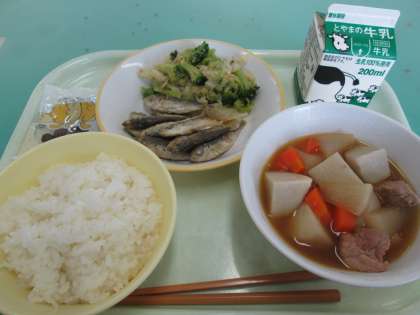 本日の献立は、里芋と豚肉のうま煮、小あじの唐揚げ、ブロッコリーのごま和え、黒糖大豆です。
