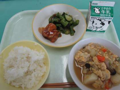 本日の献立は、高野豆腐の卵とじ、鶏肉のバーベキューソース味、海鮮サラダです。