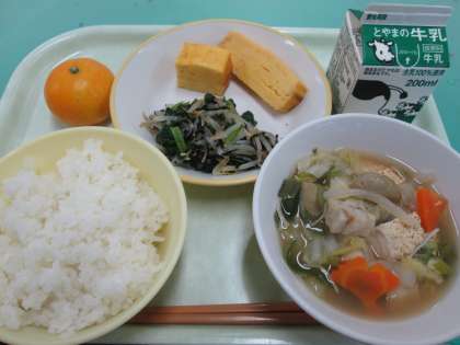 本日の献立は、厚焼き卵、磯和え、大漁鍋、みかんです。