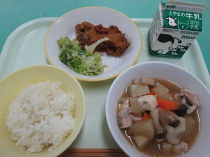 今日の献立は、ごはん、牛乳、魚の利久揚げ、レモン和え、鶏肉と根菜の煮物 です。
