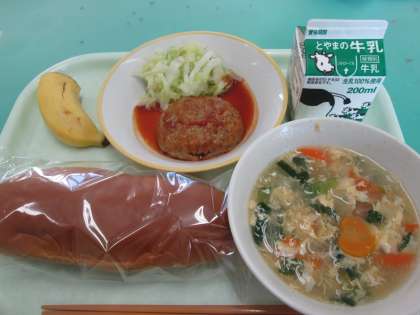 本日の献立は、コッペパン、ハンバーグのケチャップ味、ゆでキャベツ、かき玉スープ、バナナです。