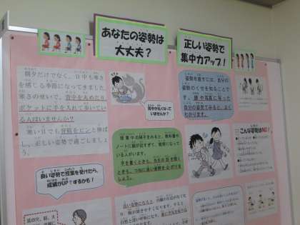 今朝は、2回目の「環境の日」です。道具箱、ロッカー、筆箱等が整っていると、もっている力を存分に発揮できるだろうと始めました。と同時に声をかけているのが、保健室便りの特集にあった姿勢です。特に、いわゆる姿勢の「グー、ペタ、ピン」のペタが気になっています(膝が伸びて足の裏が床に着いていない状態)。友達や先生の話を聞く、全力で考える、丁寧に書くという点にもつながると考えて実施しています。