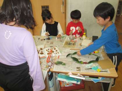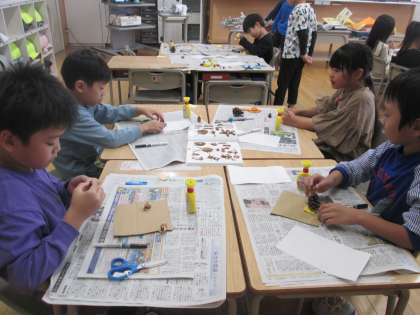 図工の時間に、ドングリやまっぼっくりなどの木の実を使って、飾りをつくり始めました。ドングリに顔をかいたり、耳をつけたりしながら楽しく制作をはじめています。出来上がりが楽しみです。