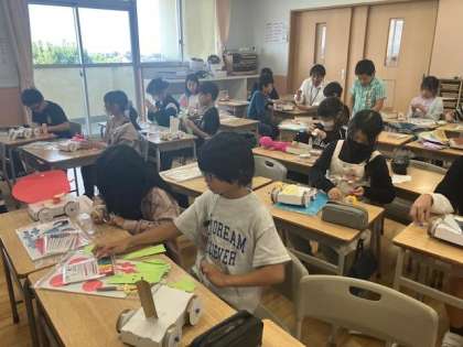 ゴーゴー ドリームカー 公開日 2024/10/11 更新日 2024/10/11 4年生 図画工作科の学習でドリームカーをつくっています。子供たちはゴムで走る車、風を受けて走る車から選びました。 動物や食べ物などを車体に乗せて、夢の車づくりに取り組みました。