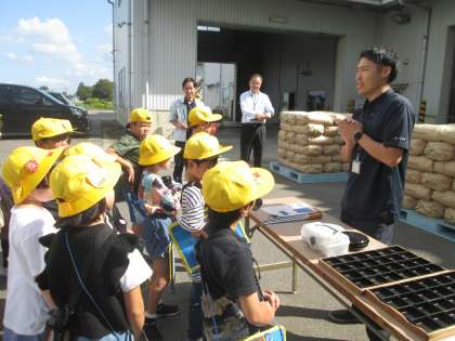 出前授業が終わって、子供たちはJAの職員の方々に案内されて、東部ライスセンターの見学に行ってきました。