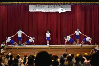 まずは5年生。団の曲や演技を自分たちでつくりあげてきました。動きを合わせようと練習を重ねることで、学年力も高めています。また、学校田で育てた「もち米」販売の準備も進めました。PTAの方と一緒に、本校のもち米を使った「ポン菓子」づくりの手伝いにもチャレンジします。