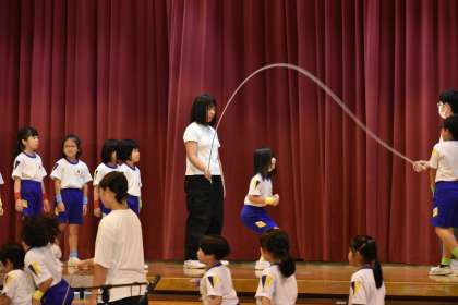 2年生は、なわとびと跳び箱の技を披露します。休み時間にも練習をする姿が多く見られ、全員が前よりもできる技がふえたり、上達したりしています。マット、跳び箱の片付けも、自分たちの発表の中で行います。