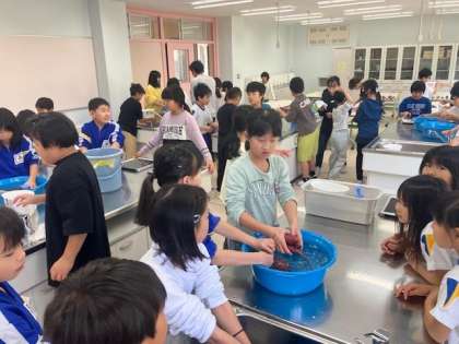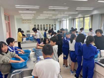 みんなで協力して、水を替えながらサツマイモを3回洗い、濡れたサツマイモをタオルで拭いてました。