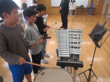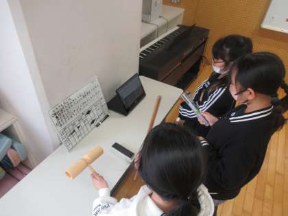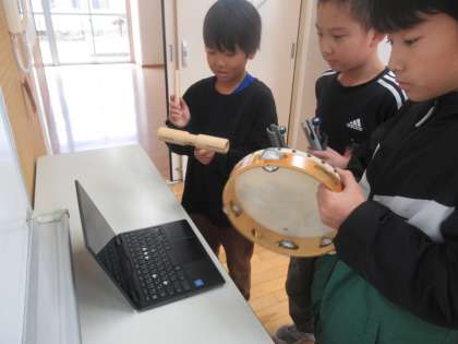 いろいろな音のひびきを楽しもうの学習では、3人グループで音楽づくりをしています。自分で決めた楽器のひびきを生かしながら、音の重ね方やつなげ方を工夫していました。また、友達と意見を交わしながら、試行錯誤して音楽づくりに熱中する姿はとてもすてきでした。