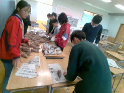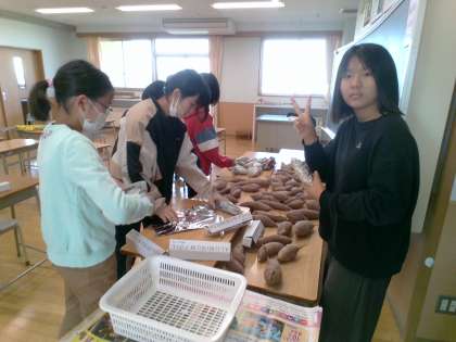 焼き芋をするために、新聞紙やアルミホイルで巻きました。