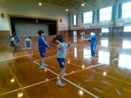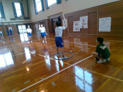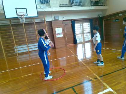 体育科「アツアツ!ベースボール!」では、昨年度のティーベースボールから仲間の投げたボールを打つ活動に進化しました。まずは打つ練習をグループごとに行いました。