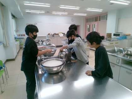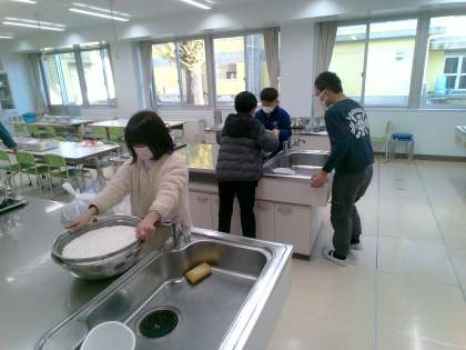 もち米を水からあげました。朝からもちつき大会に向けて協力して活動しています。