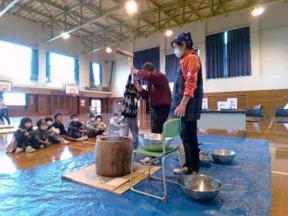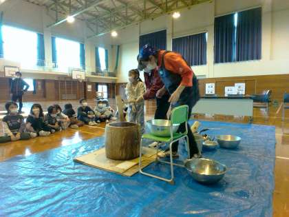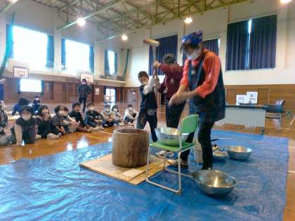 2年生全員が杵を使ったもちつき体験ができました。重たい杵を手伝ってもらって、一生懸命持ち上げて頑張りました。周りの友達から「よいしょ、よいしょ」と声援がとんでいました。