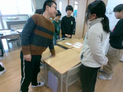 5年生 外国語「At a restaurant.」 公開日 2024/12/02 更新日 2024/12/02 5年生 今日は、これまで学習してきたことを生かして、お店屋さんとお客さんに分かれて注文や値段のやりとりをしました。