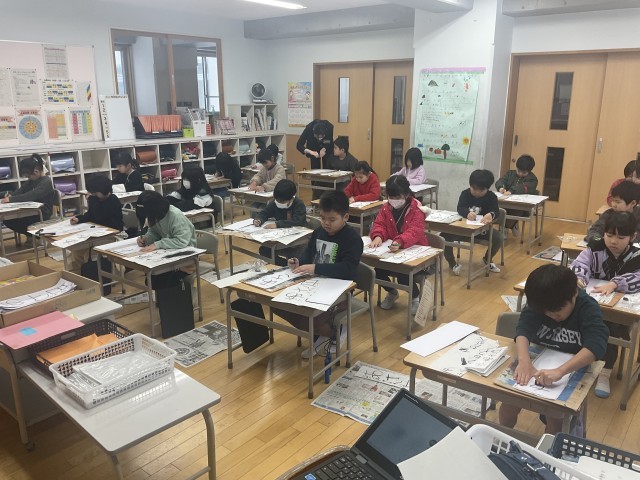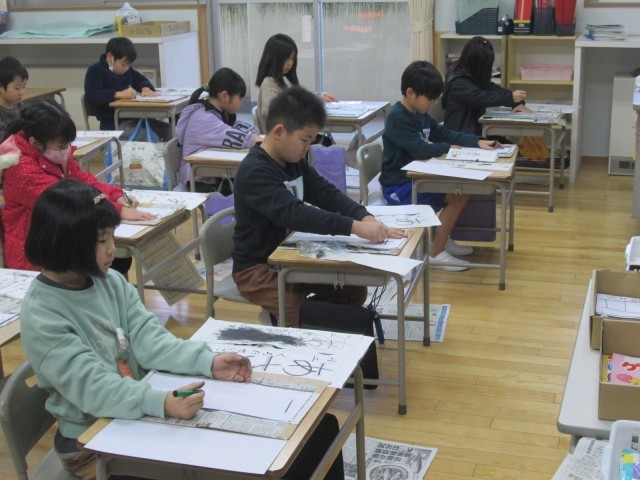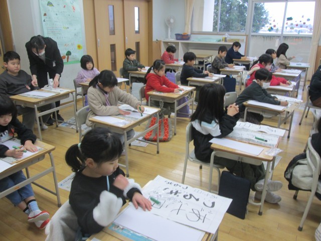 みんな一様に緊張した面持ちの中、子供たちは真剣に書き初め大会に取り組みました。冬休みの間に何度も練習を重ねてきたことがうかがえるほど、全員が昨年の作品よりも上達していました。