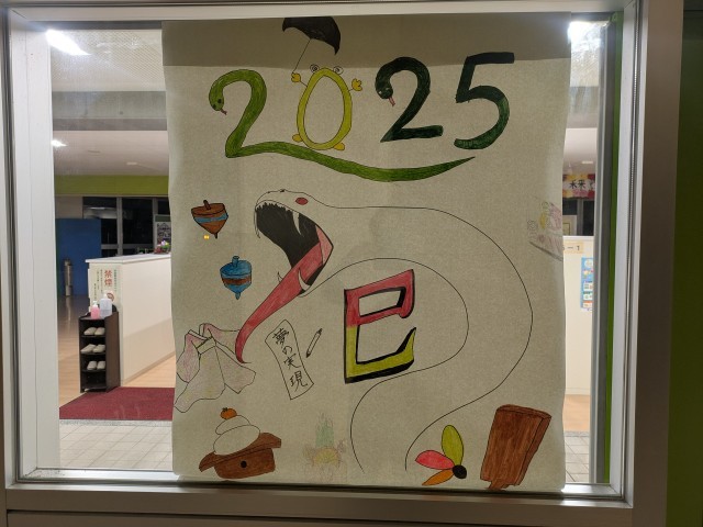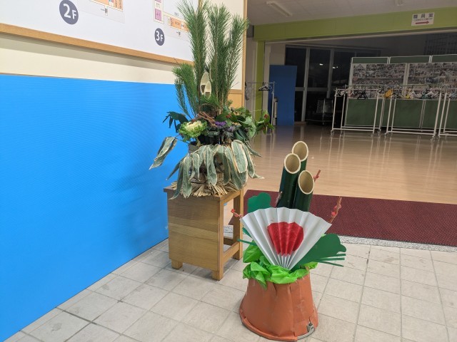 登校してすぐ、多くの子供が「あれ?あのヘビは、誰が書いたの?」「先生たちからの年賀状があるね」などと話していました。玄関先に、6年生が2学期末、年始の掲示を作成し、貼ってくれていました。他学年の多くが下校した後に、こっそりと年始の掲示を貼ったようで、初めて目にする子供が多かったようです。また、新年の登校に合わせて、先生方からのメッセージも掲示しました。さらに、佐山用務員さん、そして6年生が作った「門松」も玄関前に堂々とありますし、奥井先生が生けてくださった花も、校内のいろいろなところに飾ってあります。新年を迎えたことを、太田っ子みんなで感じることのできる粋な計らいを、とても嬉しく思います。