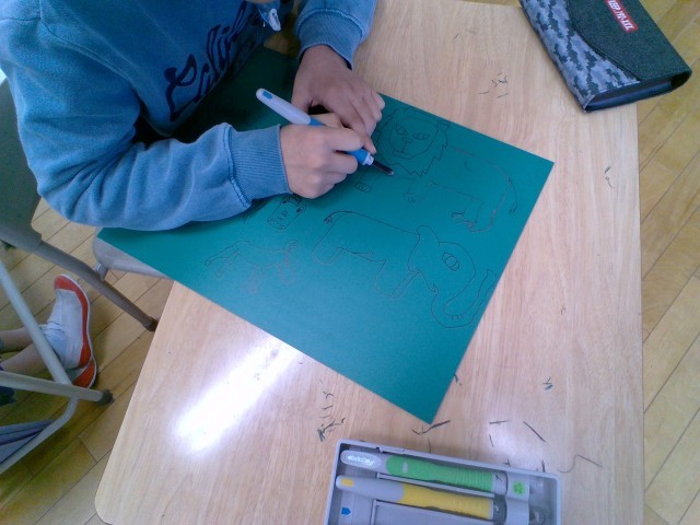 「版画に挑戦 〜生き物の世界〜」を学習しています。初めて彫刻刀を使いました。