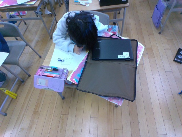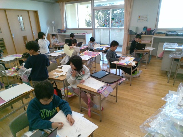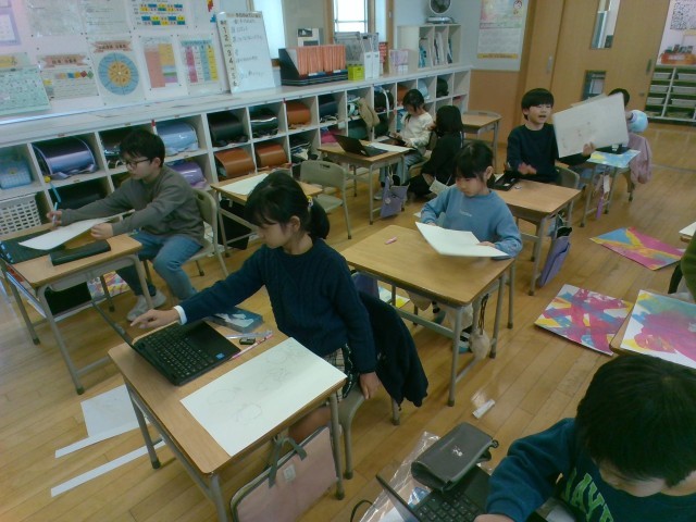 子供たちは、生き物の世界を想像して描いた型紙をつくり、前回ローラーでインクをのせた画用紙に配置して貼りました。それぞれ自分の表したいことを見付け、様々な色や形を考えて、どのように表すかを考えて作っています。