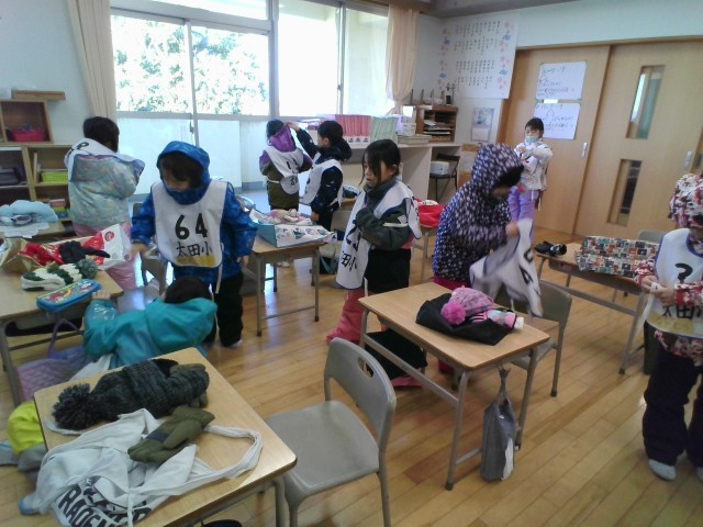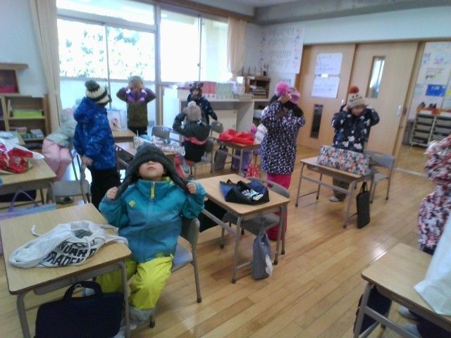 もうすぐ、雪っ子遠足です。スキーウエアの着脱の練習をしました。ファスナーのあけしめや、手袋に指をしっかりいれるなど、楽しそうに行っていました。23日の遠足が楽しみです。