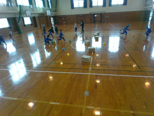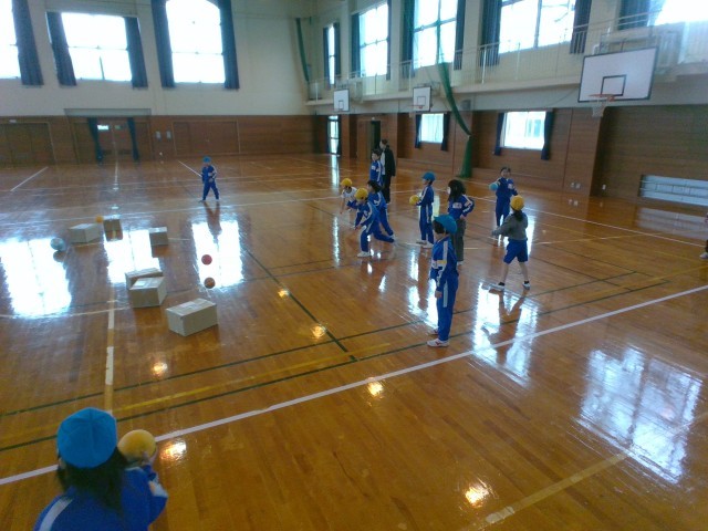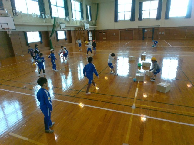 段ボールを的にして、ボールを当てて動かすゲームを行いました。子供たちは、自分たちの陣地に段ボールが入らないように、自分なりに投げ方を工夫したり友達と協力して投げたりすることによって、勝敗を受け入れながら楽しくゲームができるようになりました。