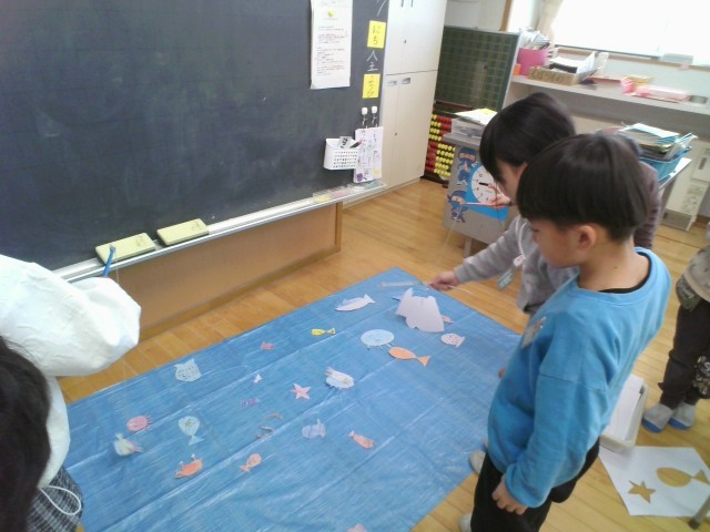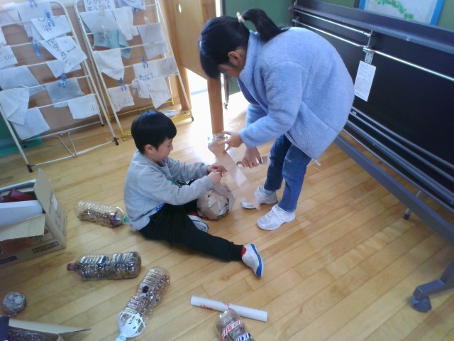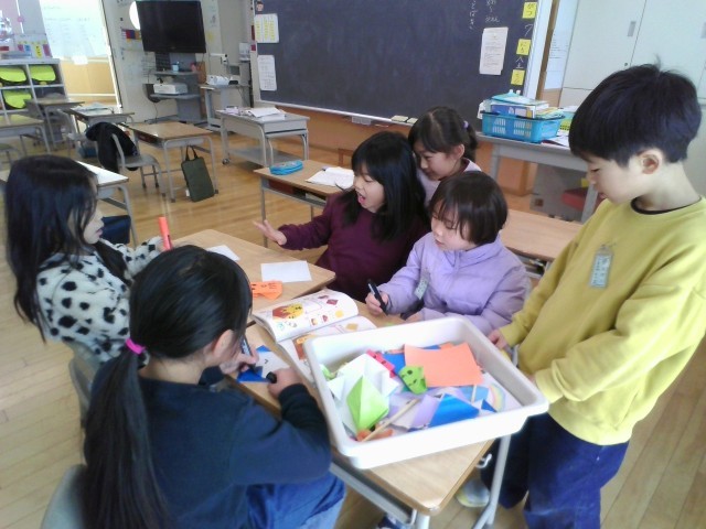 1年生は、お店屋さんを開いて一緒に遊ぼうと計画を立てています。そのために、グループでおもちゃをつくったり遊び方を考えたりしています。新1年生が来てくれるのをとても楽しみにしています。