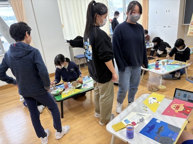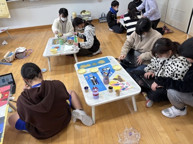 個人の絵が仕上がり、同じ板の友達とそれぞれの絵を、どのように繋げるのかを考えています。