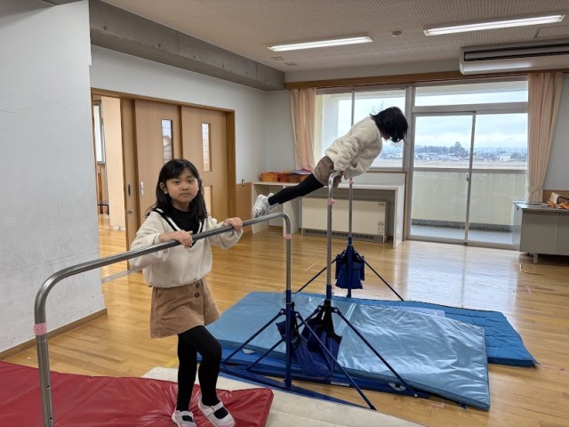 2年生には、逆上がりが得意な鉄棒名人がたくさんいます。寒さに負けずくるくる回っています。