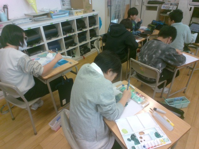 5年生 図画工作科「まだ見ぬ世界」 公開日 2025/03/06 更新日 2025/03/06 5年生 一枚の写真から想像を広げて、周りの世界を描きました。 今までの学習した塗り方を生かして、作品づくりに取り組んでいます。