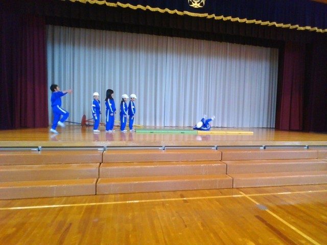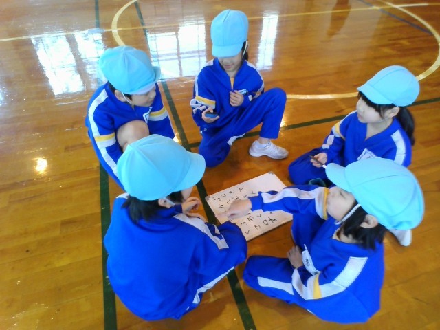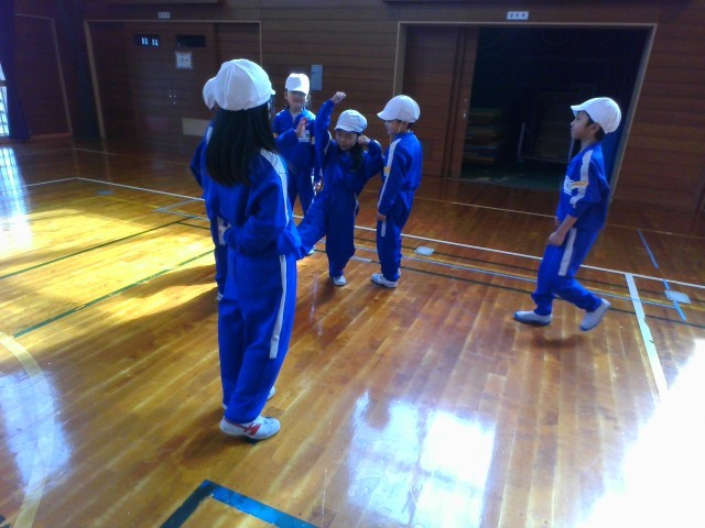 体育の時間に、表現あそびをしました。子供たちは、ポップコーンになって、はじけている様子を楽しそうに表現しました。また、「おむすびが、穴の中に落ちていく様子」など、友達と協力してつくりあげていました。グループの友達と楽しそうに相談しながら、取り組んでいました。