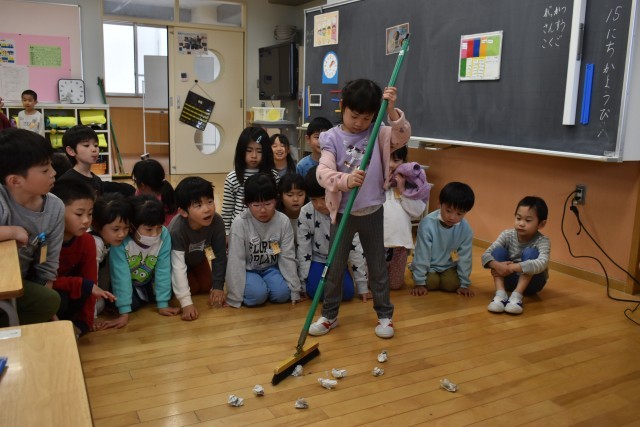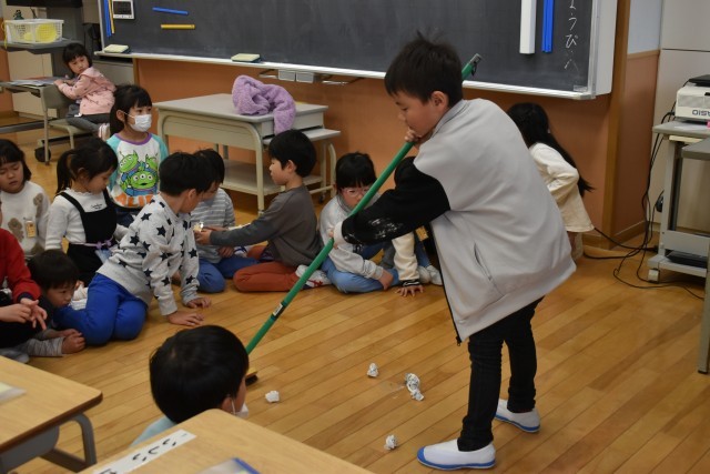 紙くずをごみに見立てほうきの使い方を確かめました。
