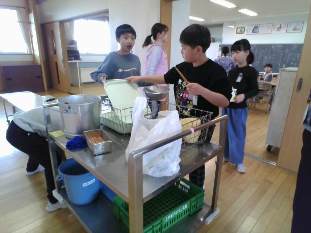 給食の時間になりました。子供たちは、食事の量も増えもりもり食べています。配膳や後始末も、給食当番や給食部が中心になって、スムーズに行っています。残食も減り、頼もしい子供たちです。