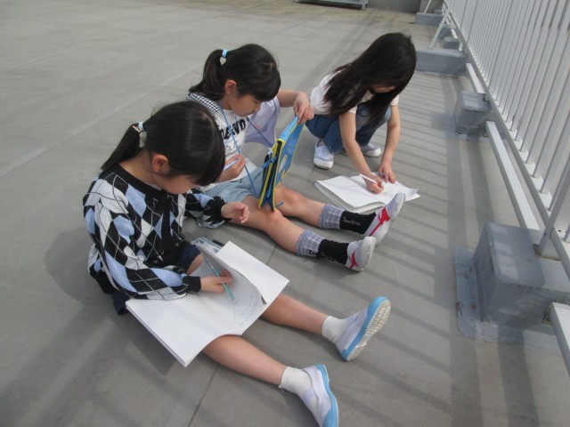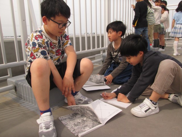 社会科の学習で、学校のまわりの観察をしました。初めて入る屋上にわくわくしながら、「北に中学校が見えるね」「西にアピタがある」と観察していました。