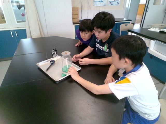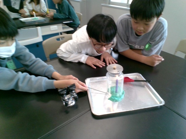 集気瓶の中でものを燃やし続けるにはどうしたらいいのか、実験をしました。